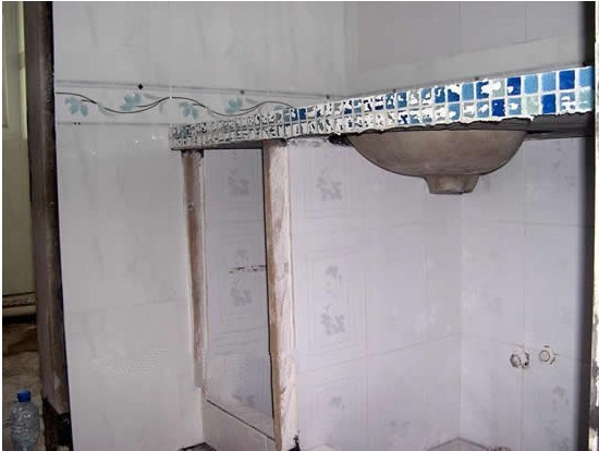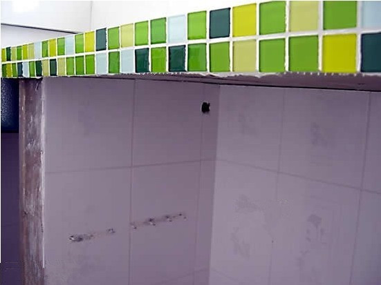 當前的高度是82CM,寬度55CM,在設計范圍之內。貼磚師傅貼的還是比較薄的。圖中開的圓孔為天然氣軟管過孔,圖中一排橫釘為了放置隔板。一個小失誤,側板設計的長出了2cm,只好用一塊馬賽克補上。還沒有安裝門,所以木龍骨顯得好陳舊。