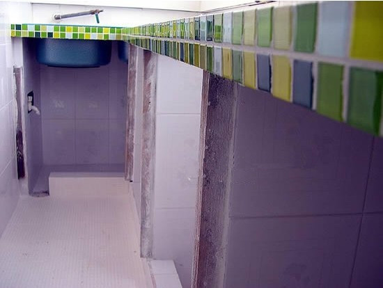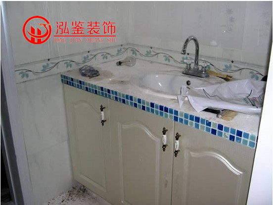 洗面臺的馬賽克。剛鋪好的馬賽克,填縫劑還未擦掉。鑲嵌的藍色氣泡水晶玻璃馬賽克,看著象海水里的氣泡。
