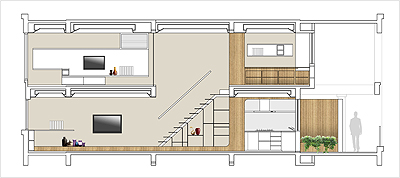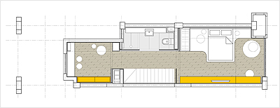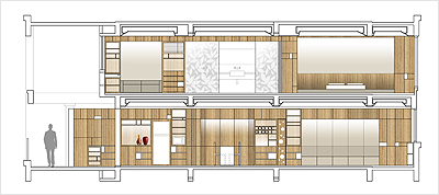 設計師在一樓及二樓分別設置了兩面“功能墻”。居住所需的各種不同功能被植入墻體內,或從墻體內延伸,這些功能包括了儲藏柜,工作臺,展示架,書架,酒柜,餐桌,沙發。。。 等。